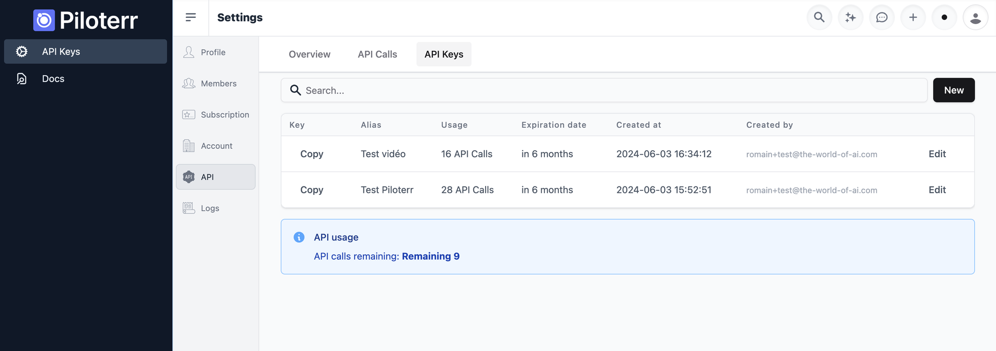 Rendez-vous ensuite dans la rubrique "API Key" et cliquez sur "New" pour générer une nouvelle clé API. Donnez un nom spécifique à cette clé, par exemple "test_video", et définissez une date d'expiration, disons le 31/12/2024.