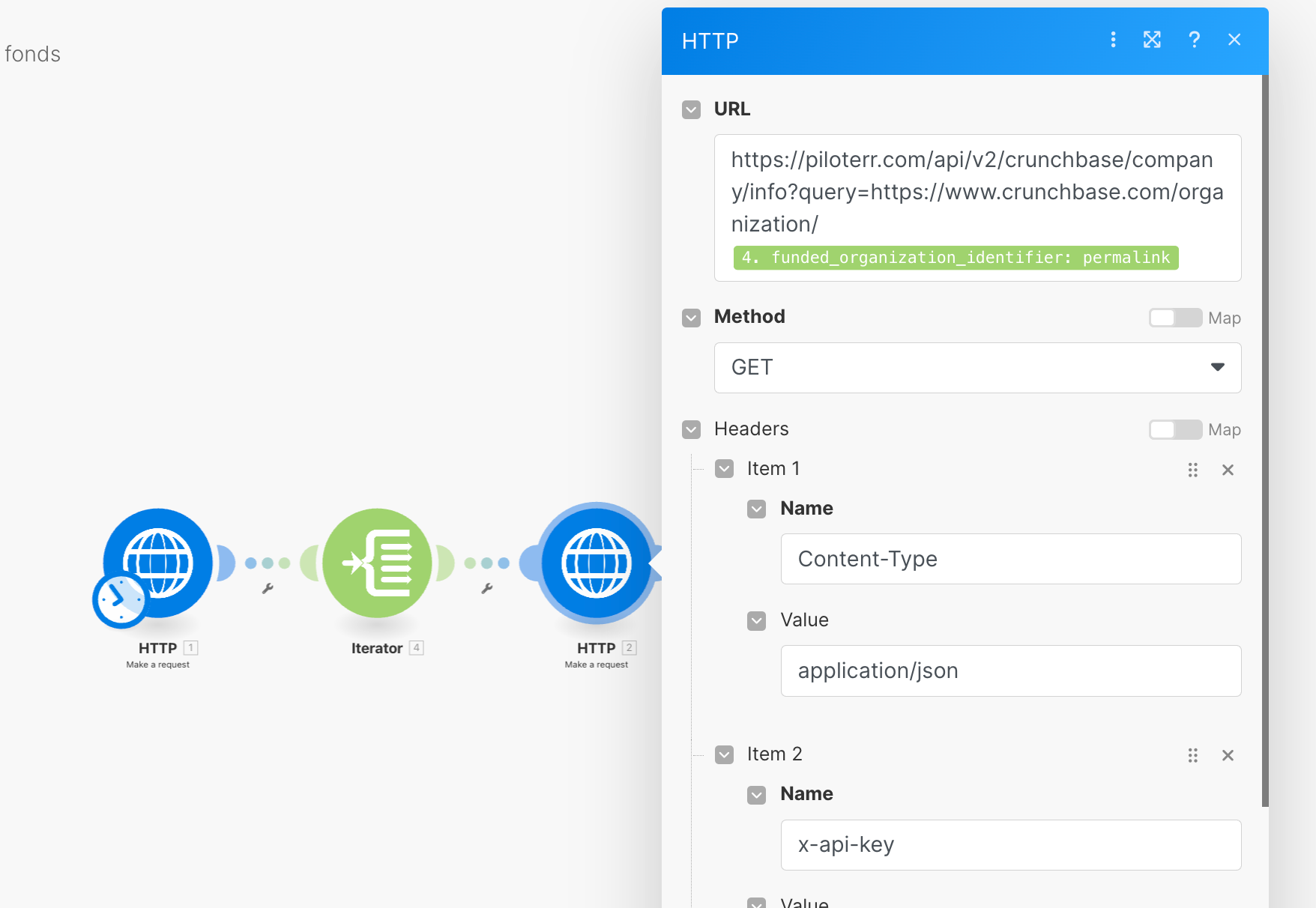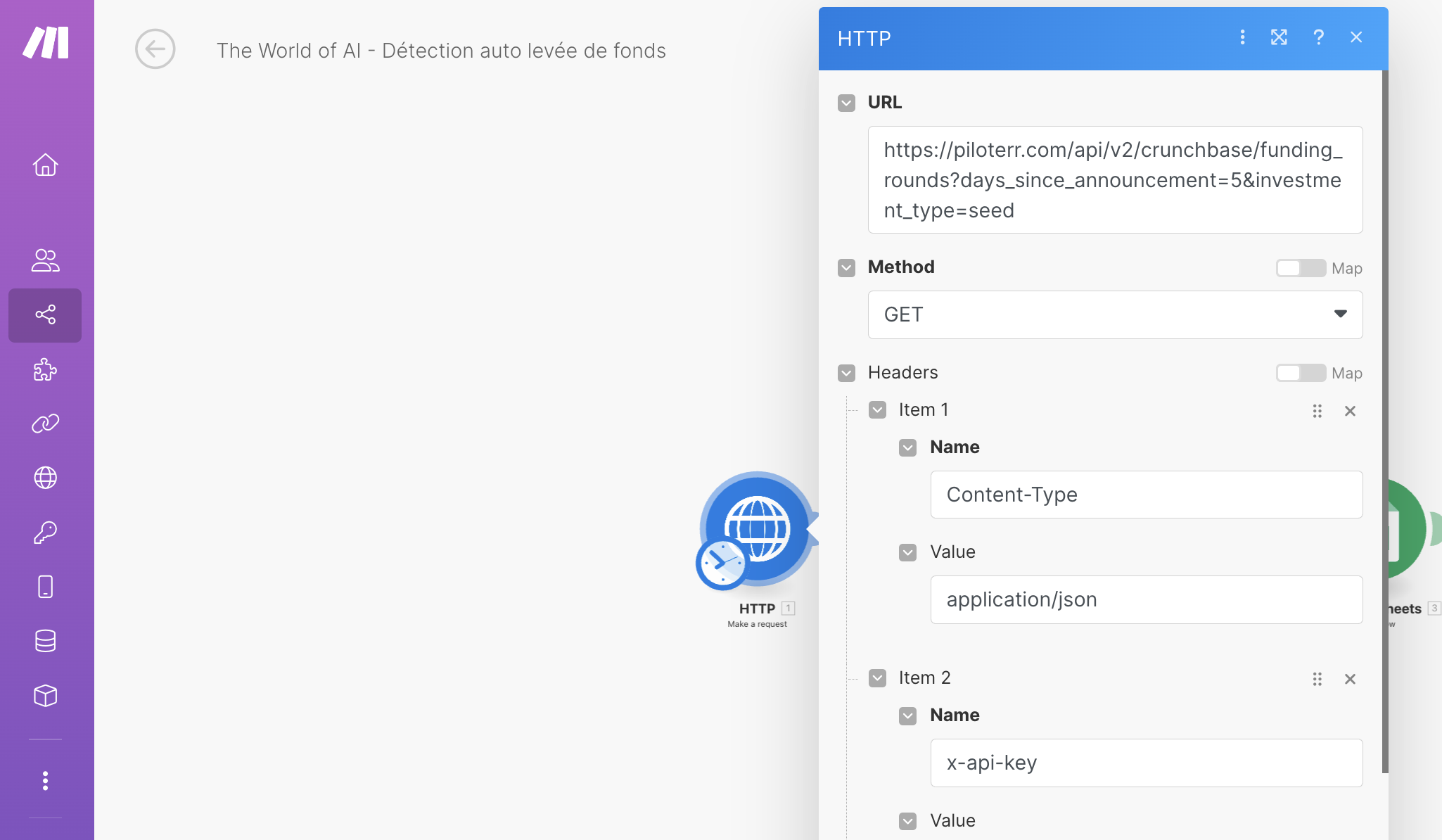 Créez un nouveau scénario et ajoutez un module pour effectuer une requête HTTP. Configurez ce module pour interroger l'API de Piloterr à partir de la documentation accessible ici et récupérer la liste des dernières levées de fonds.