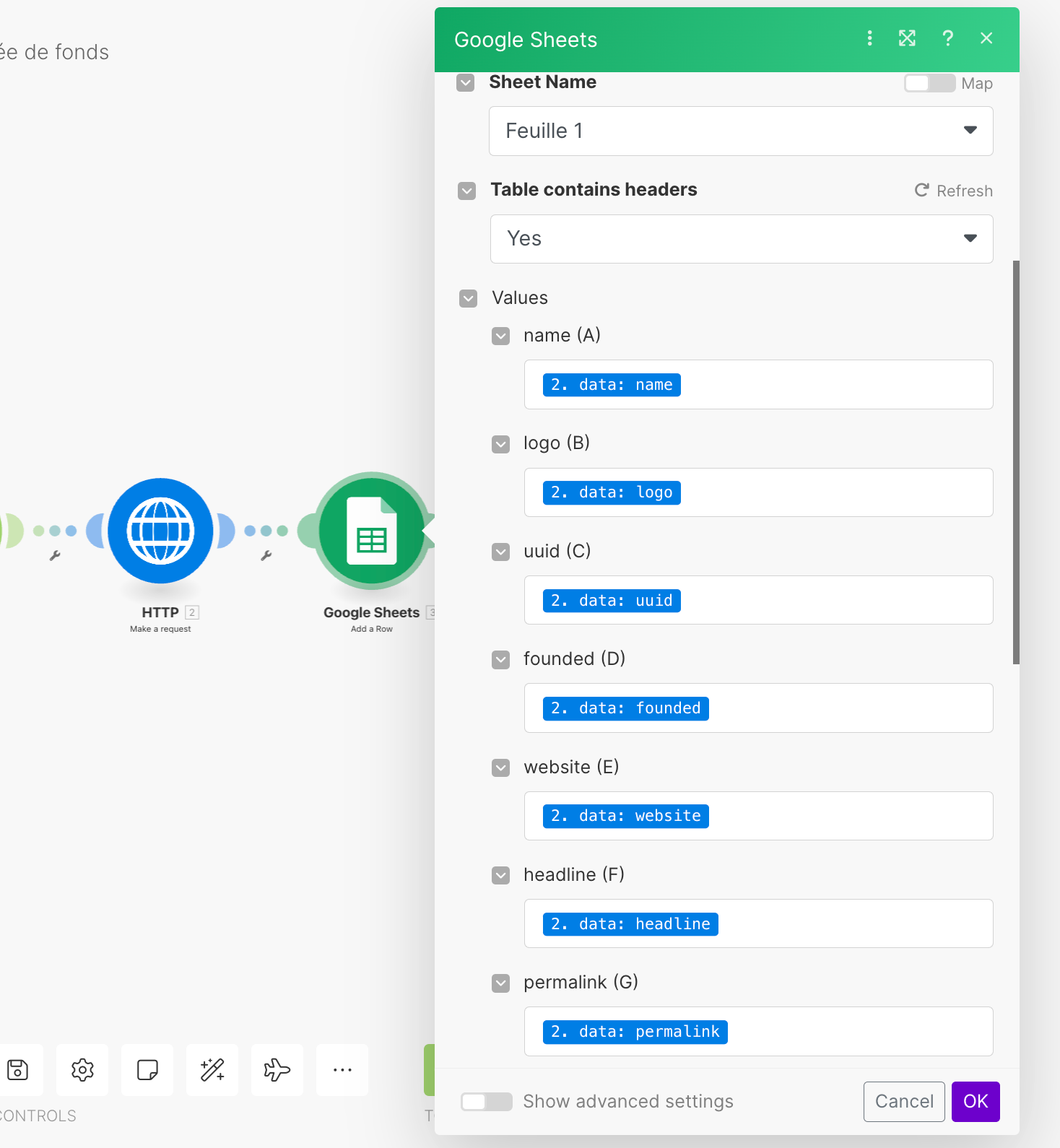 Configurez le module en spécifiant la feuille de calcul cible et en mappant les données issues des appels API vers les colonnes correspondantes.