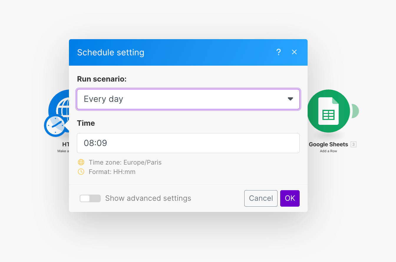 Dans Make, rendez-vous dans les paramètres du scénario et définissez une planification quotidienne à l'heure de votre choix.
