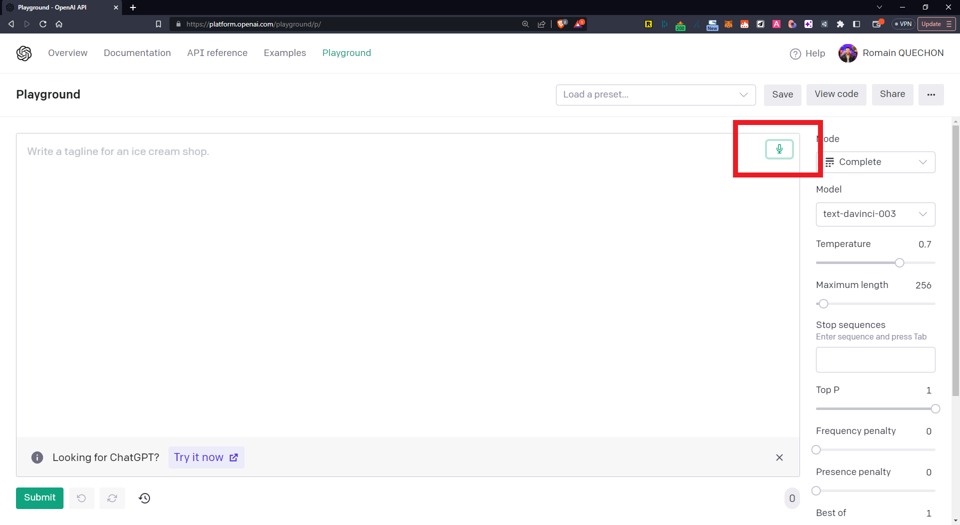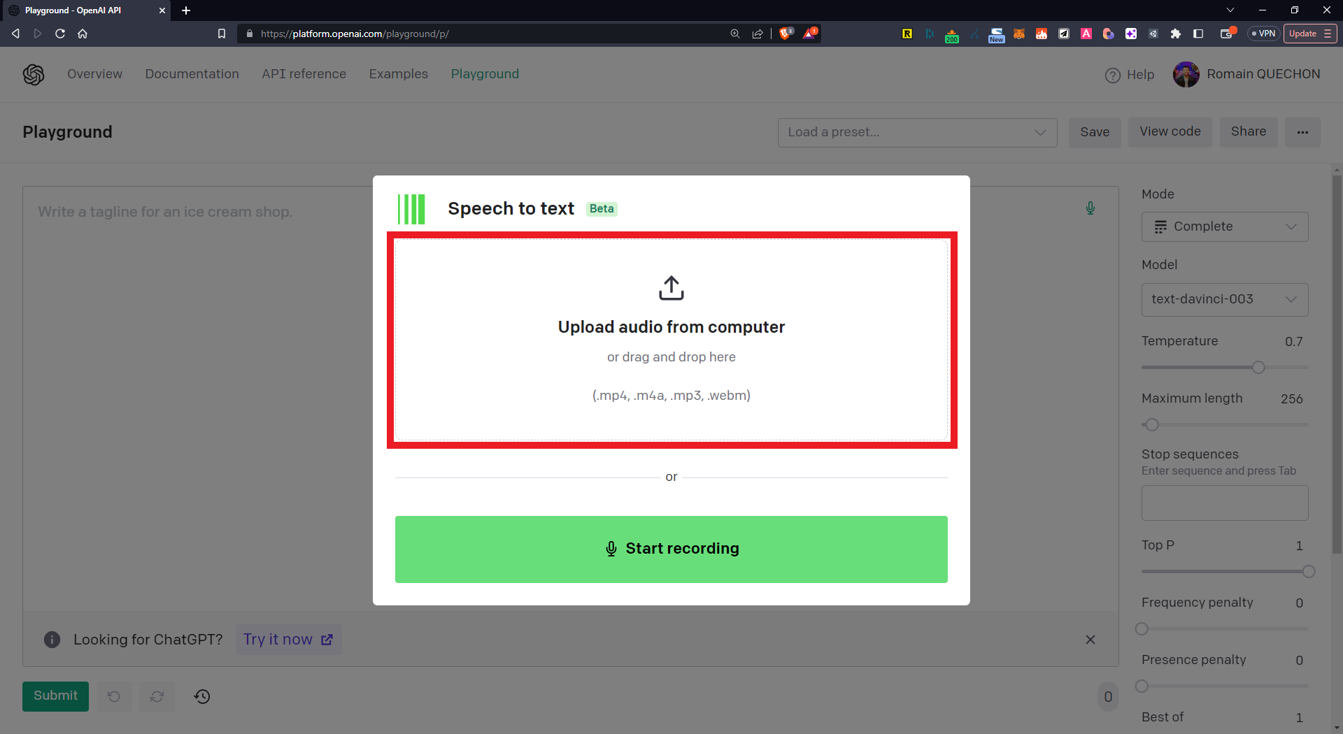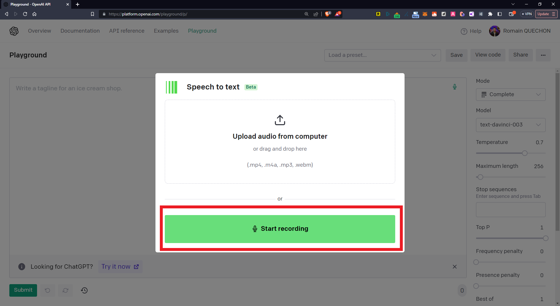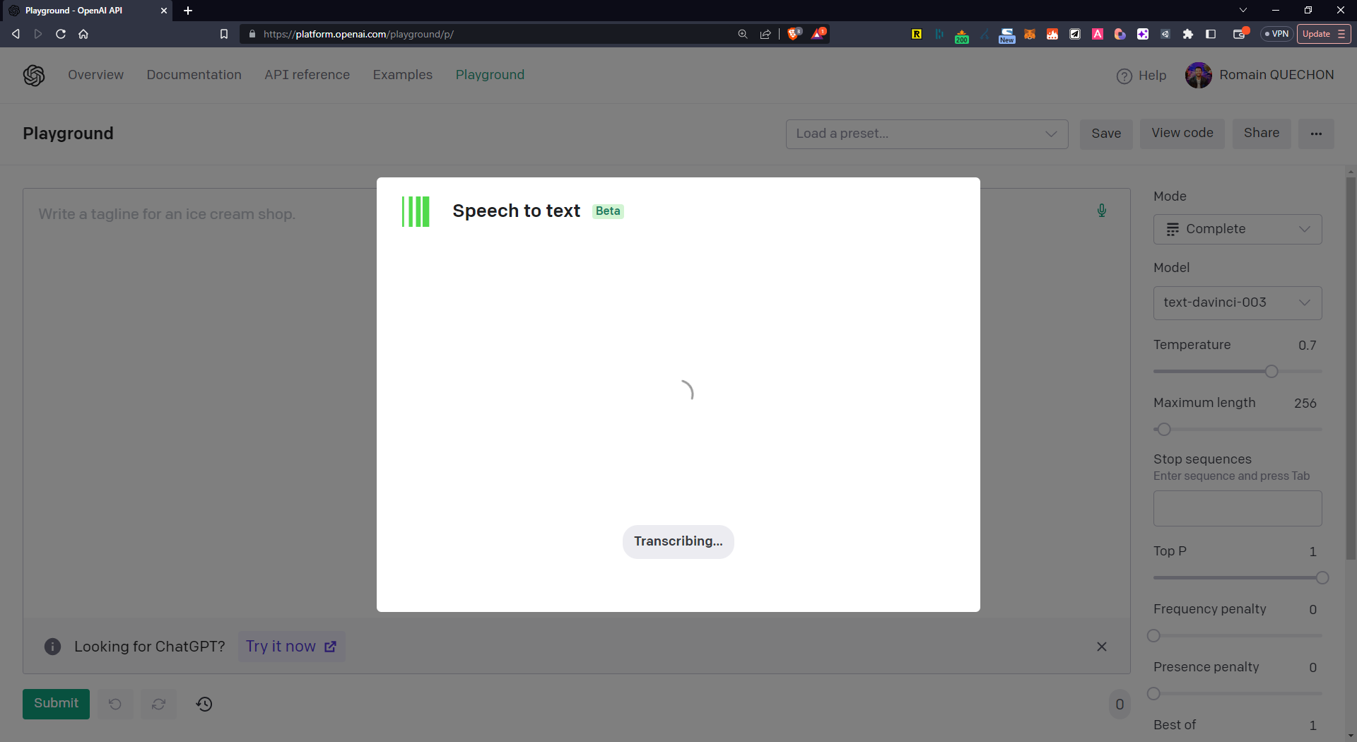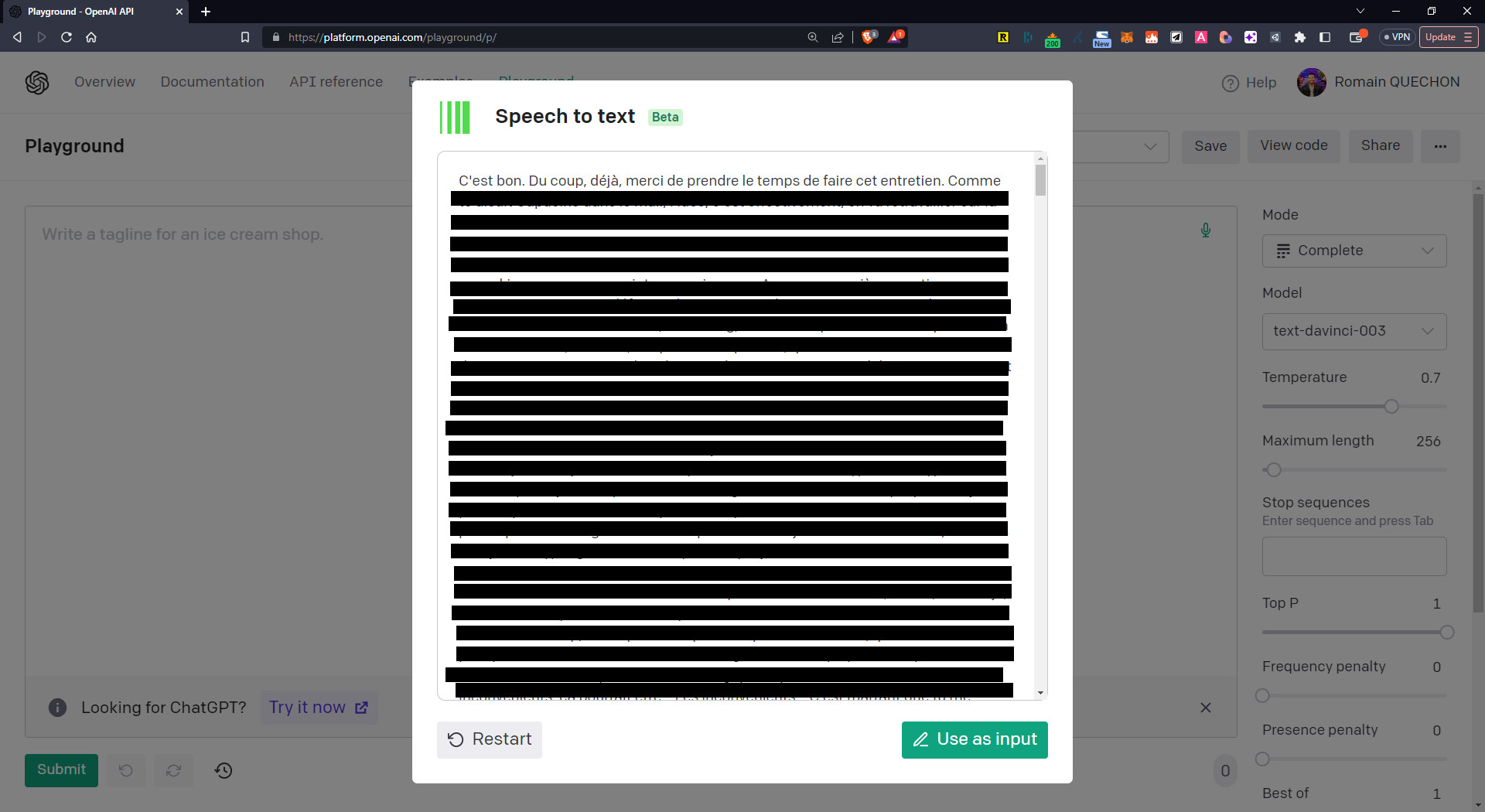 Et faites un test en disant ce que vous voulez. L'objectif est d'assurer que votre compte OpenAI et Whisper est bien fonctionnel pour la suite du process.