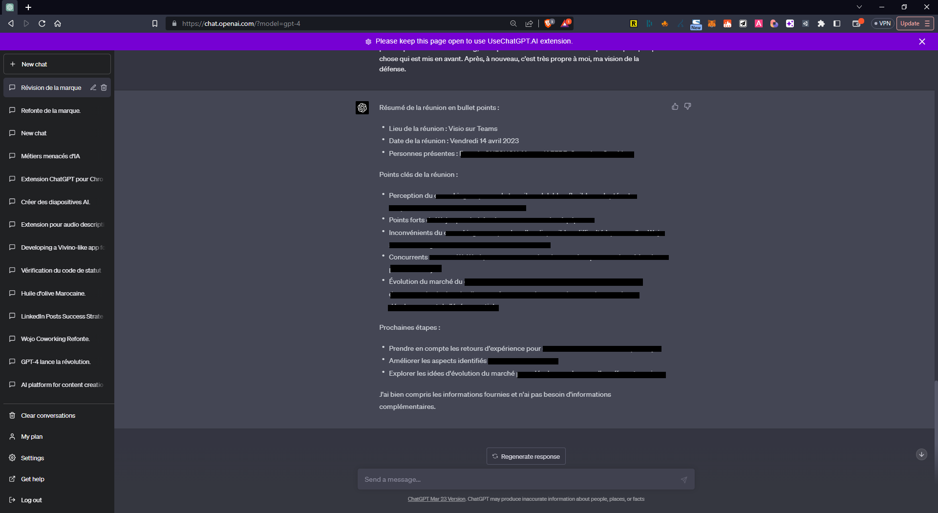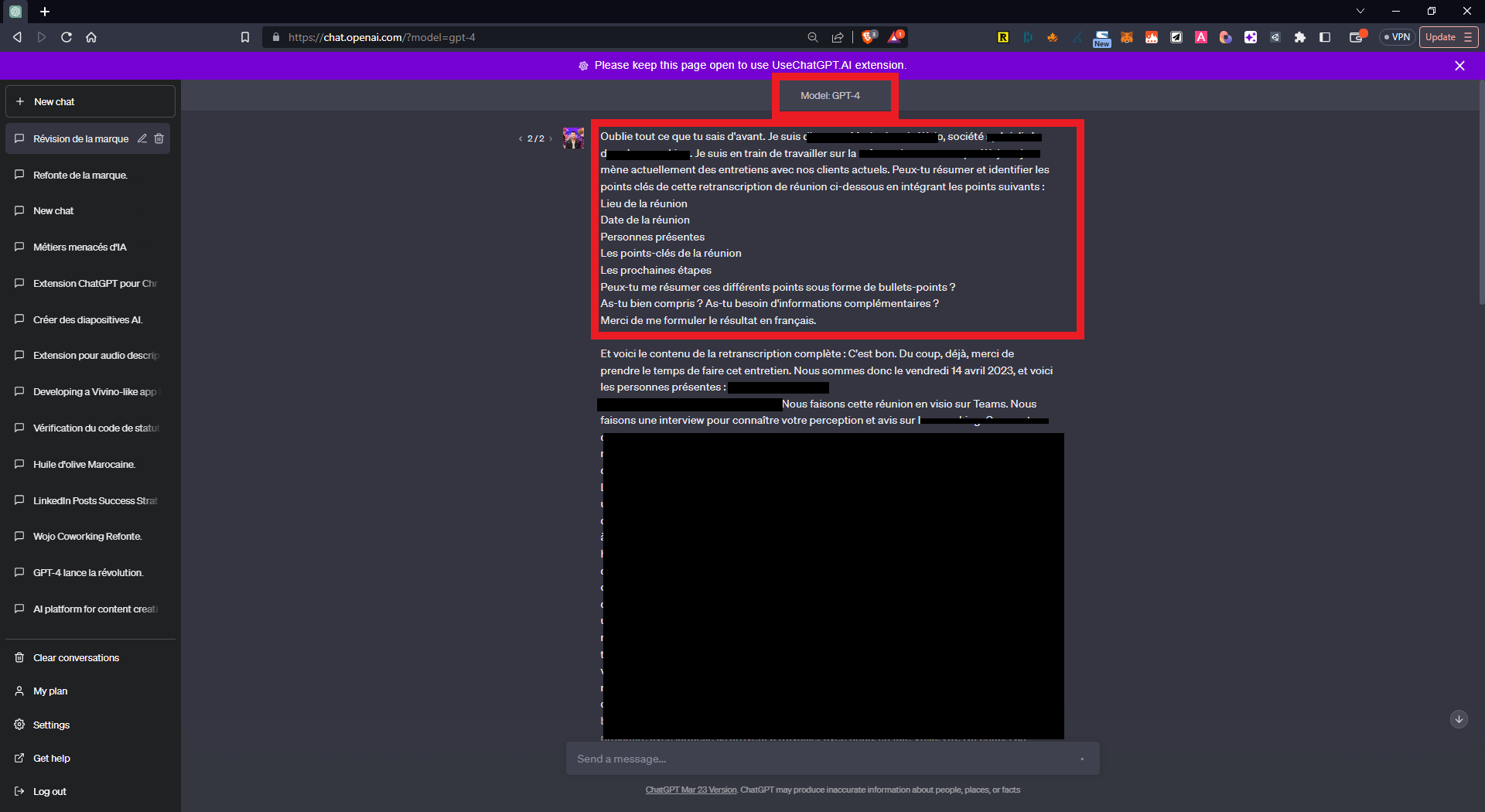- Pour le moment, ne l'utilisez pas pour des réunion confidentielles car le doute plane autour de ChatGPT & OpenAI concernant la protection des données personnelles et des données confidentielles. Récemment l'Italie et l'Espagne ont condamné la maison mère de ChatGPT concernant la gestion des données utilisées & générées par les utilisateurs de ChatGPT. Et Samsung en a payé les frais... Donc soyez bien vigilants