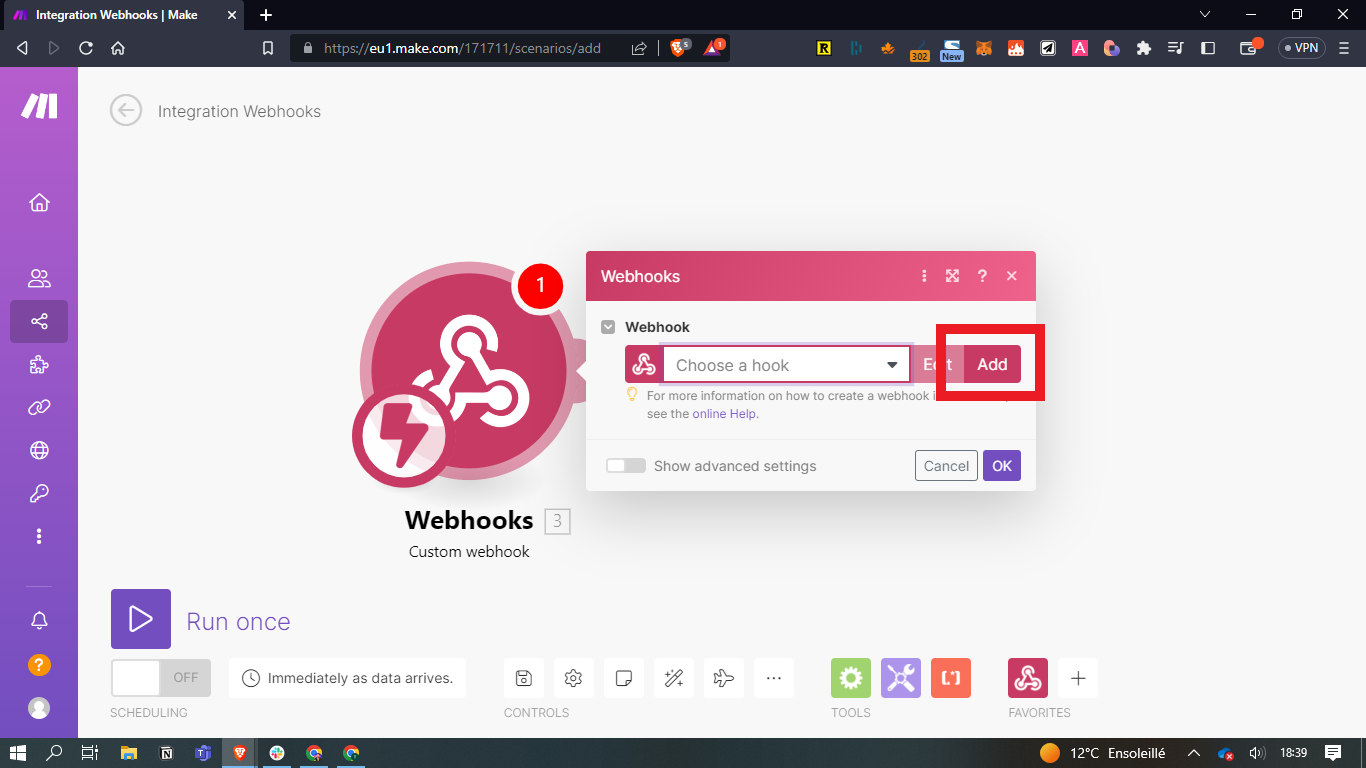 L'étape suivante va consister à créer un Webhook dans Make :