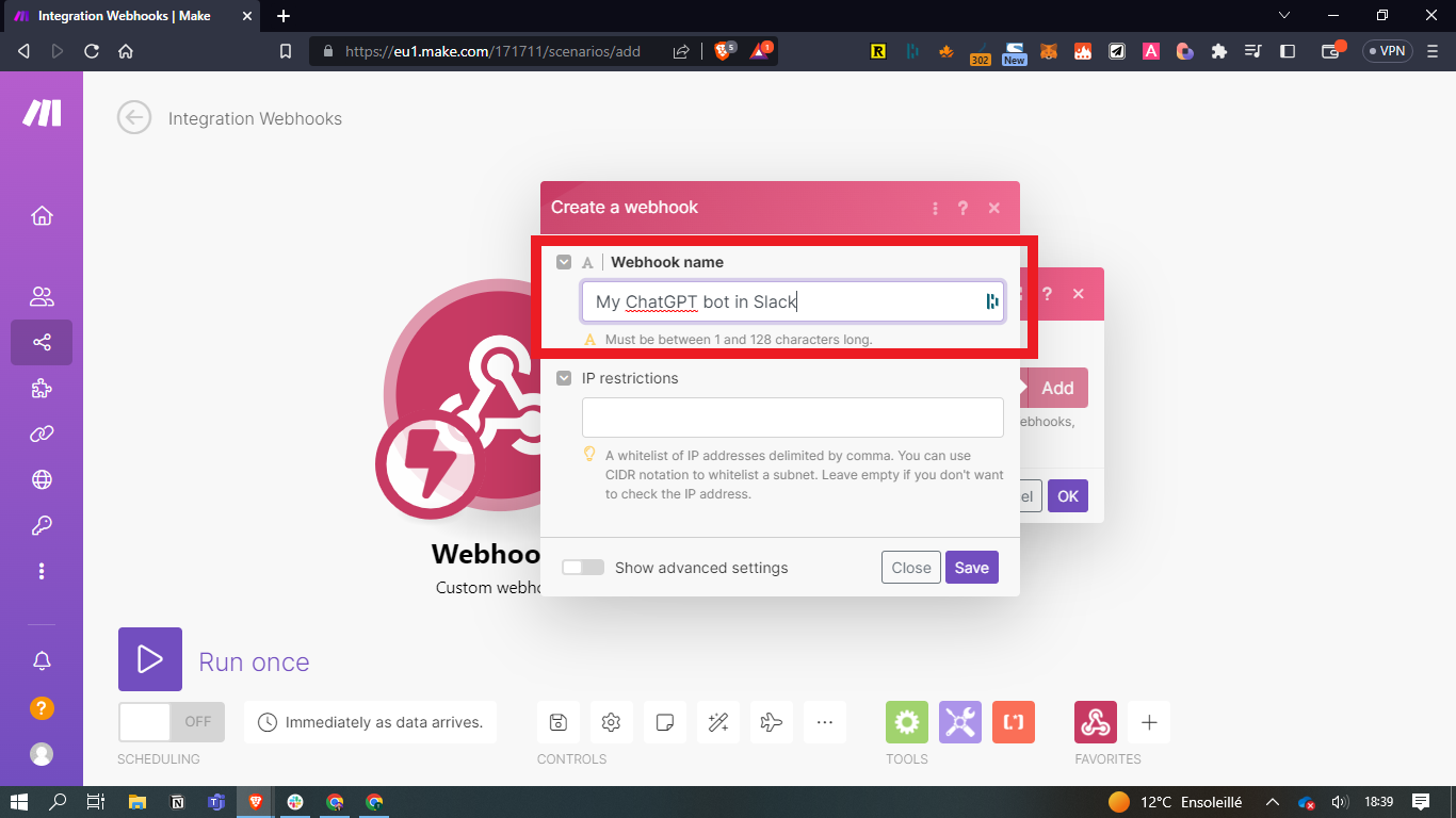 - Donnez le nom que vous souhaitez à votre webhook - exemple "My ChatGPT bot in Slack", puis cliquez sur "Save"