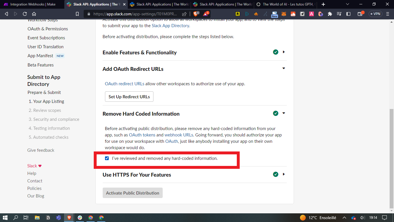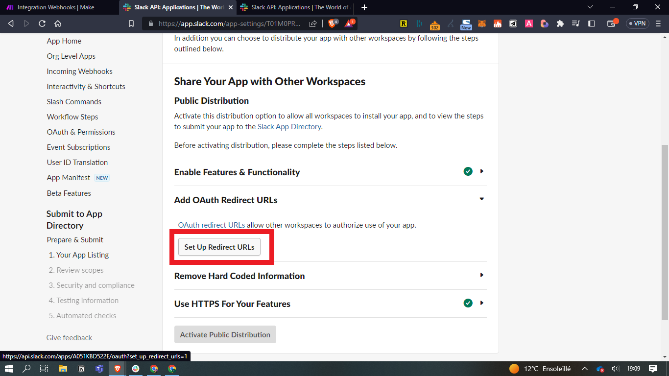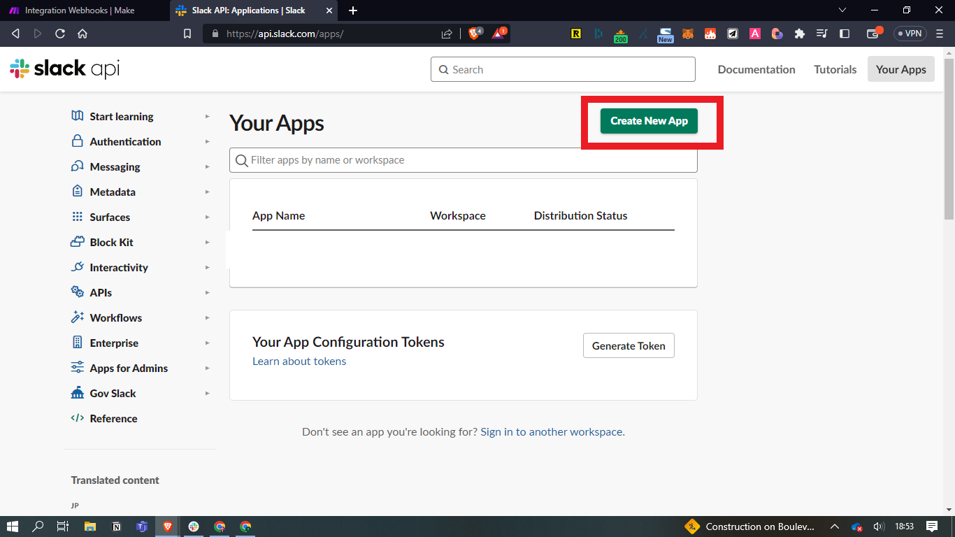 - Vous devez arriver sur la page permettant de gérer les applications reliées à votre Slack