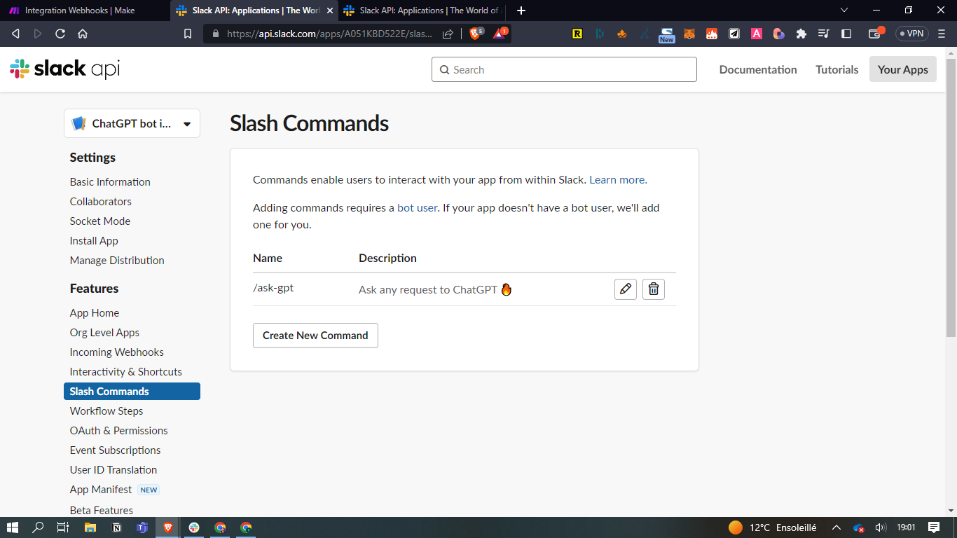 - Cliquez sur "Slash commands" / "Create new command"