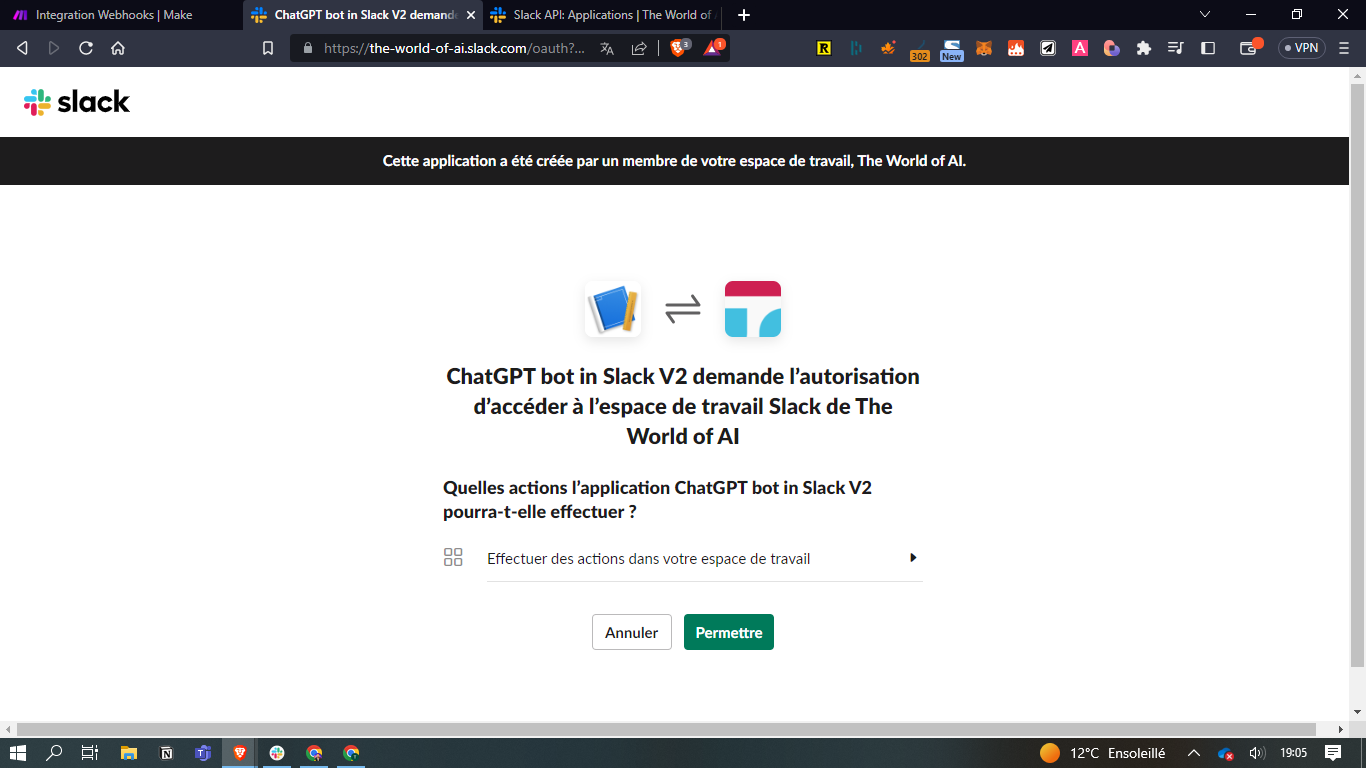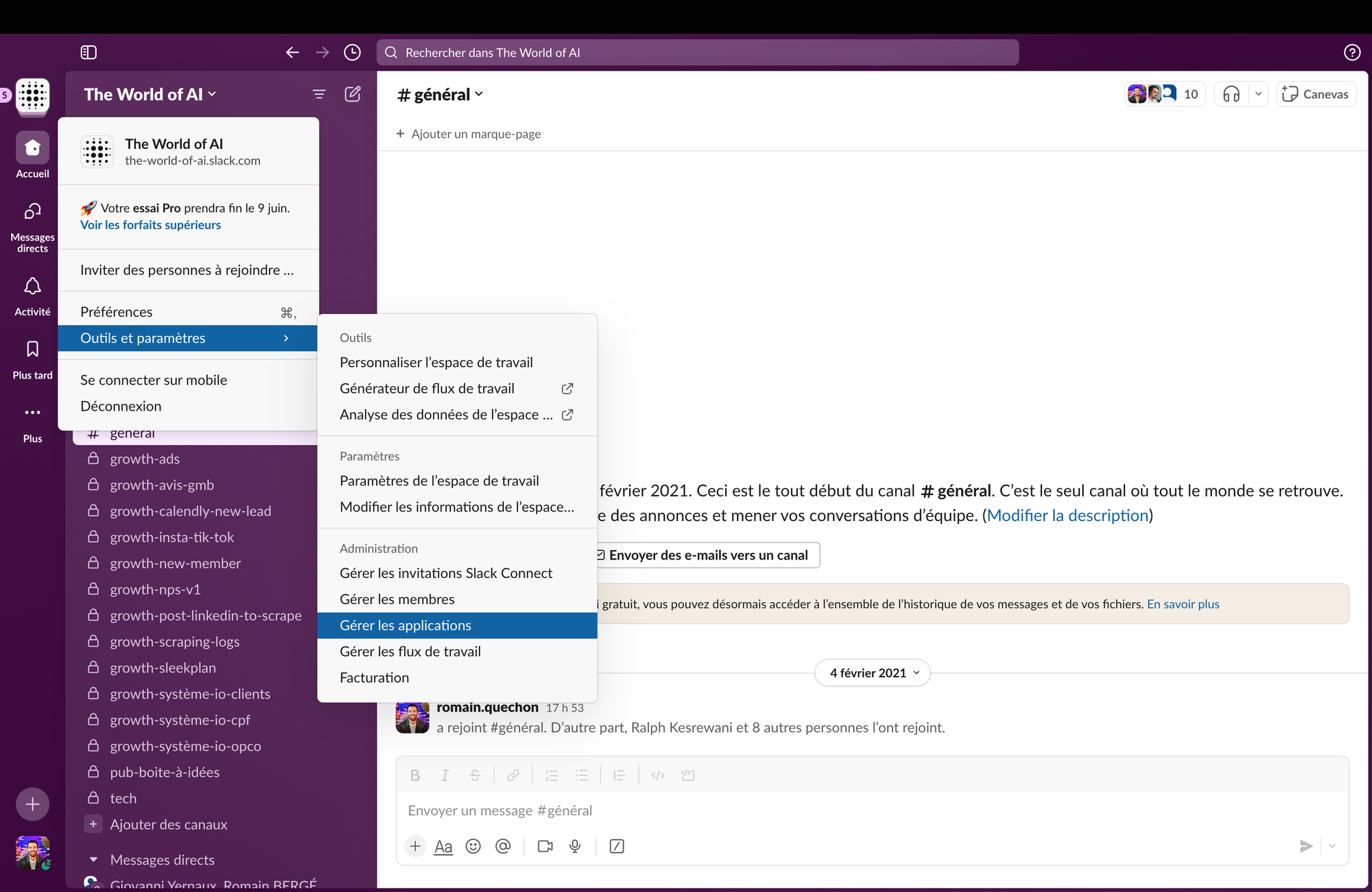 De mon côté, je suis propriétaire et administrateur de mon propre Slack 'The World of AI'. Sinon, rapprochez-vous du responsable IT en charge de l'administration de votre compte Slack.