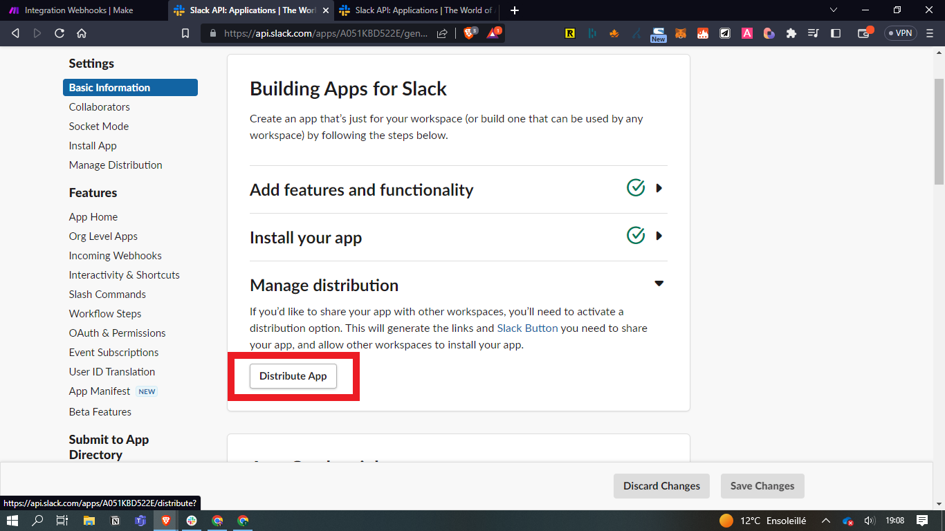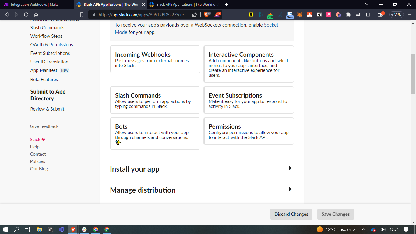 - Allez sur votre Slack, puis "Outils et paramètres" / Gérer les applications