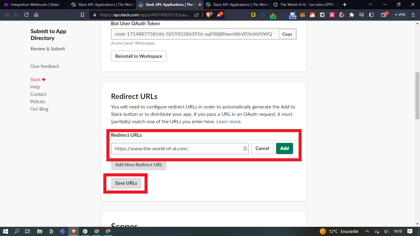 - Allez ensuite dans la rubrique "Redirect URLs", puis renseignez l'URL de votre site web. Exemple : https://www.the-world-of-ai.com/