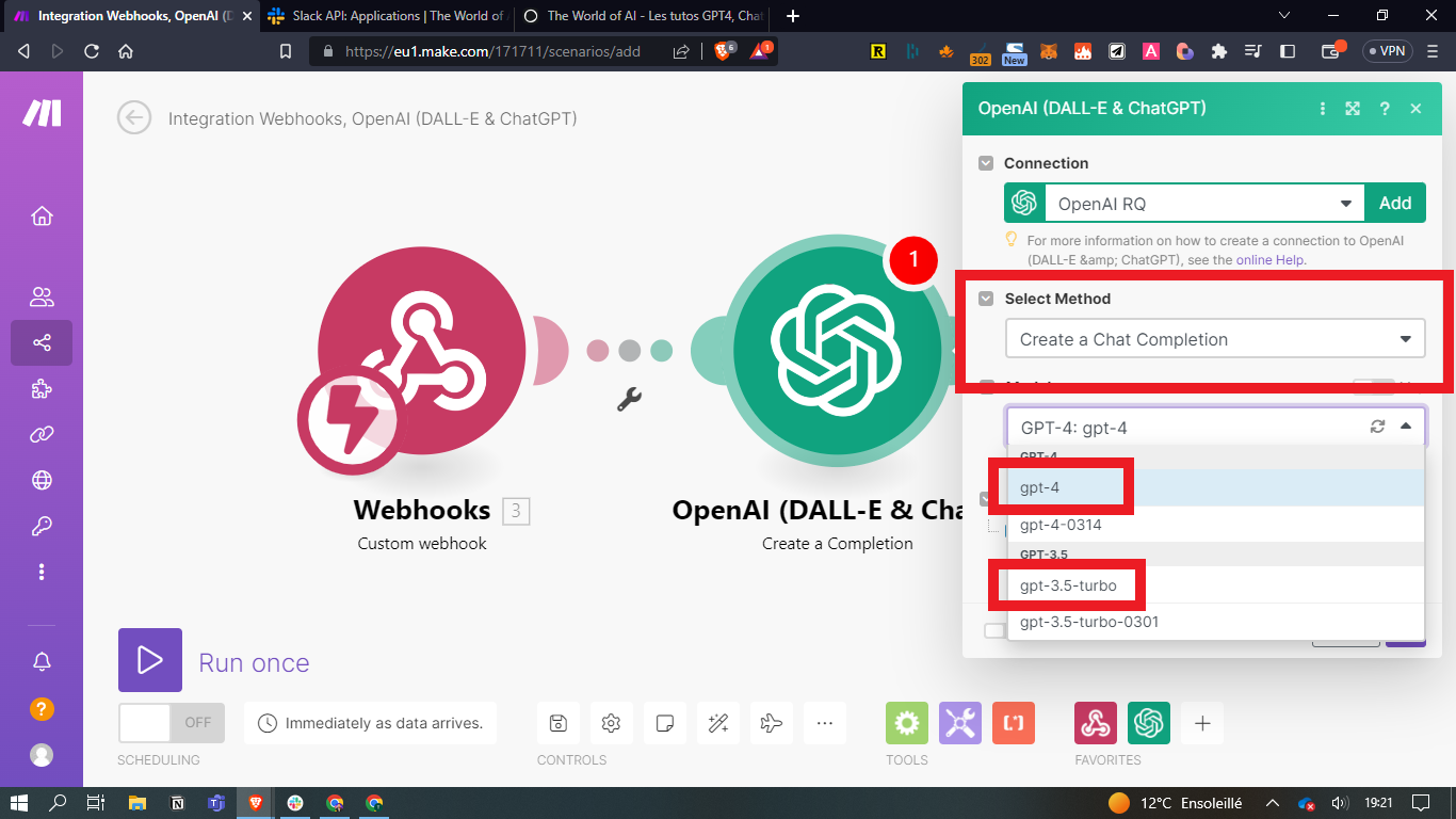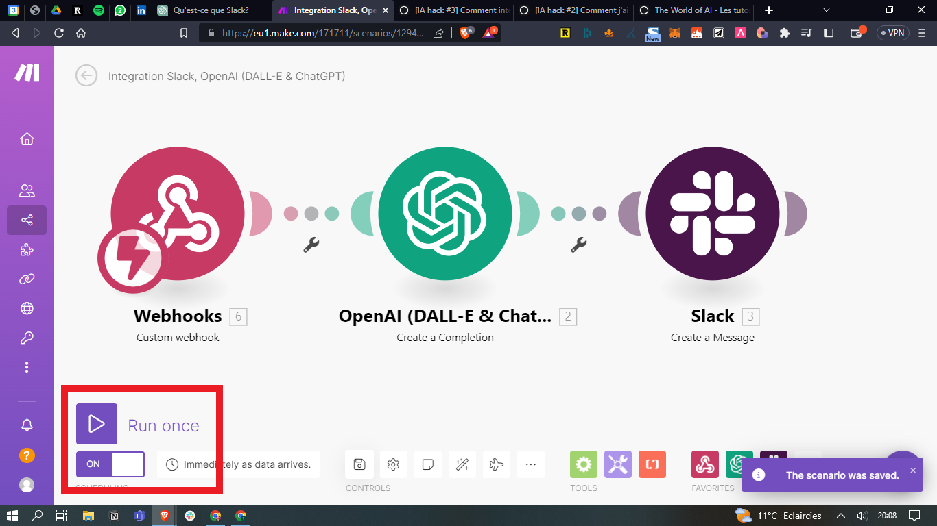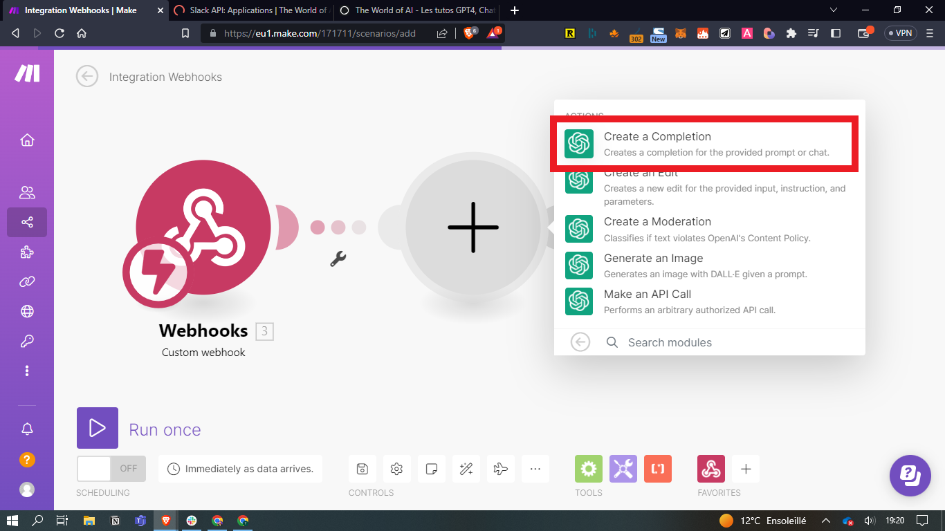 - Créez ensuite le 3ème module avec Slack / Create a message