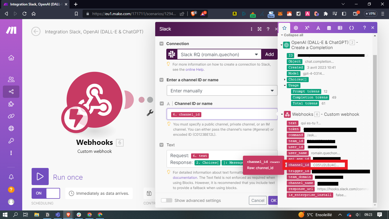- Channel ID or name = channel_id (info disponible dans le module 1 du webhook)