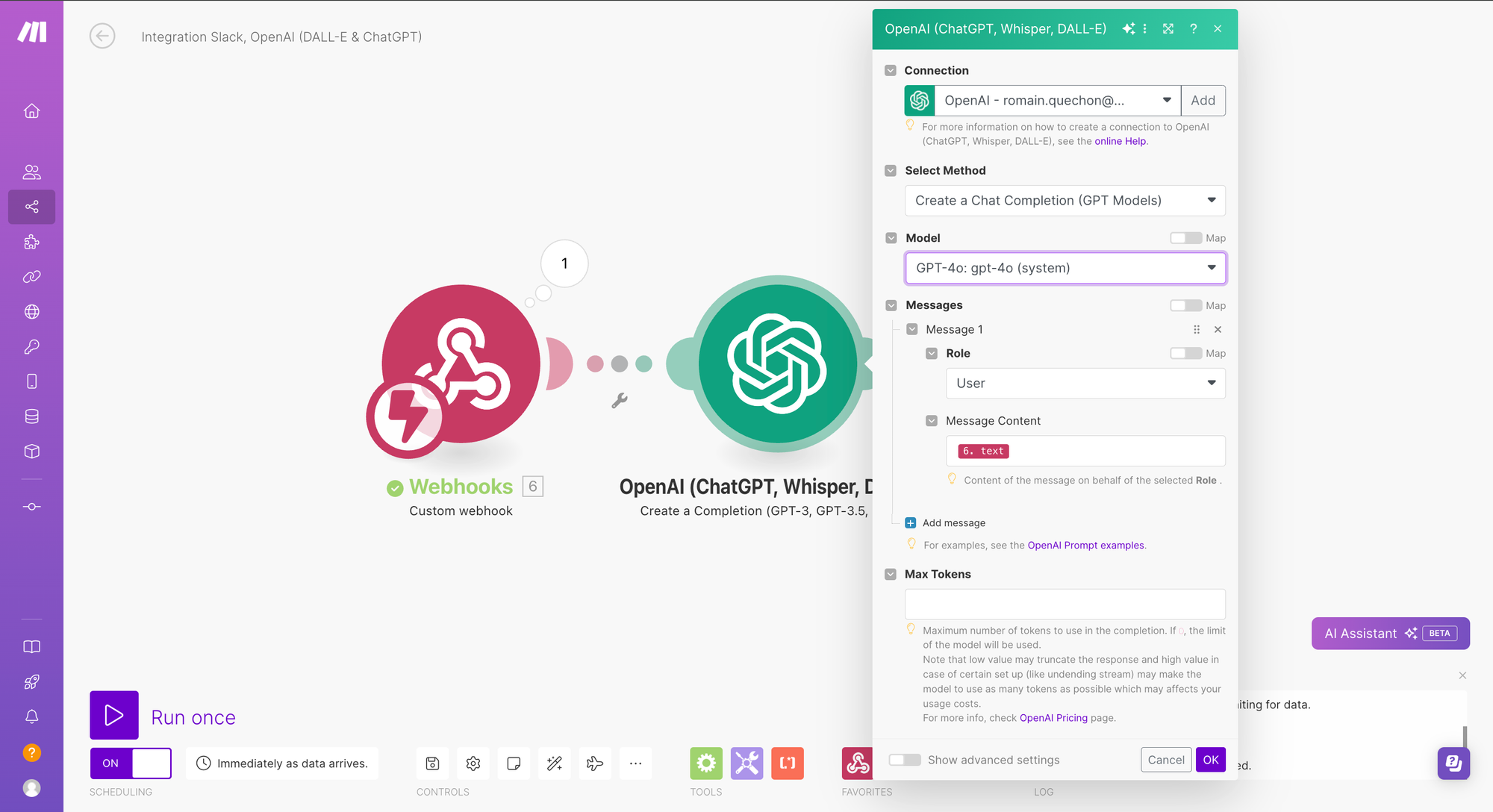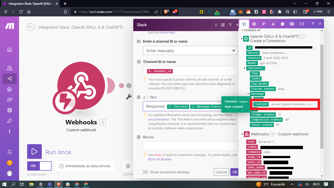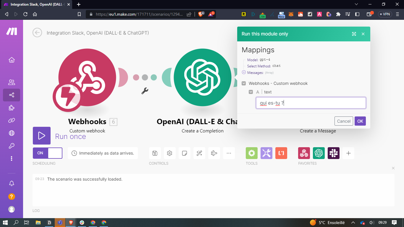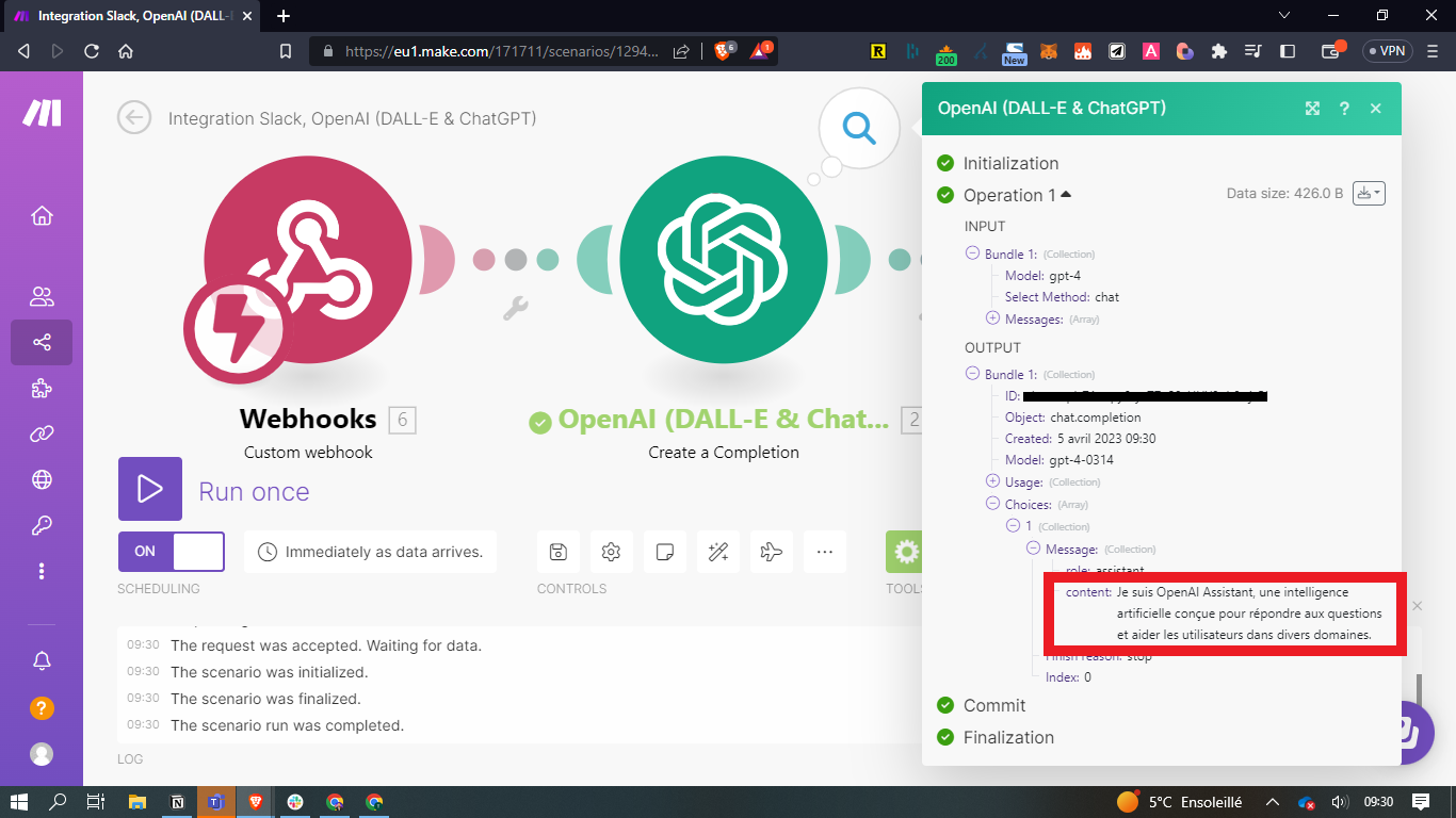 - Dans Make, faites un clic droit sur le module OpenAI (DALL-E & ChatGPT) / Run this module only et envoyez un prompt test. Exemple : qui es-tu ?