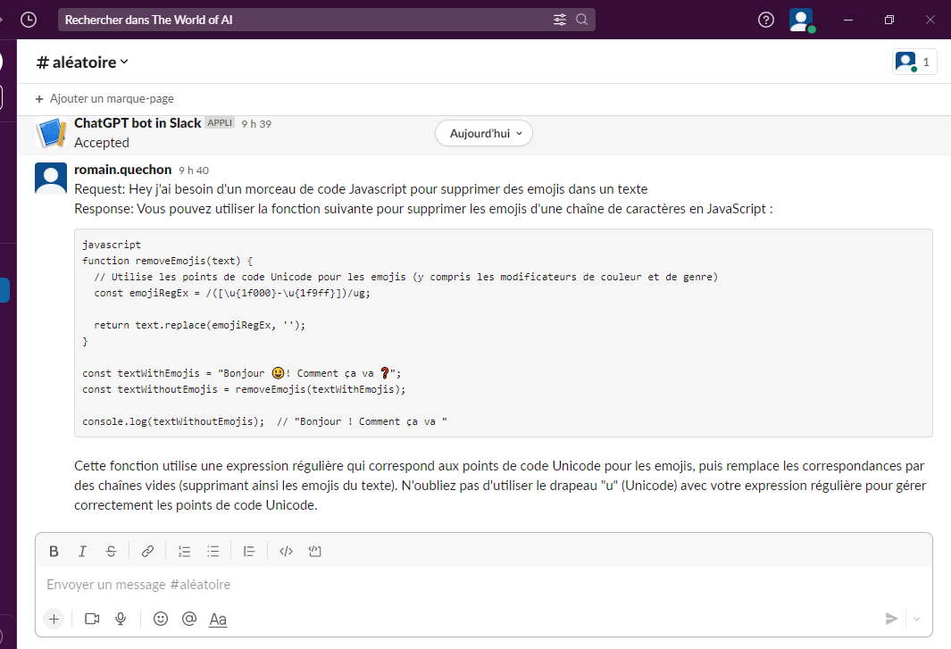 - besoin d'envoyer un morceau de code en JS à vos devs ? Demandez à ChatGPT directement dans Slack