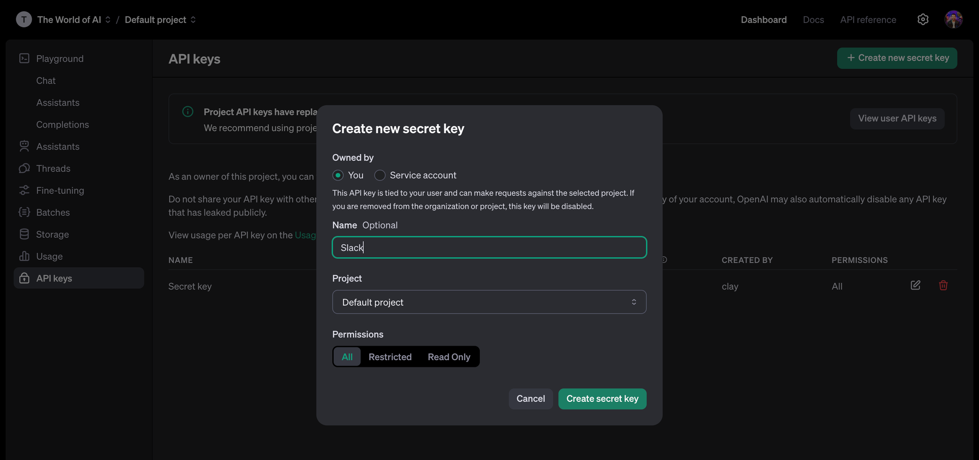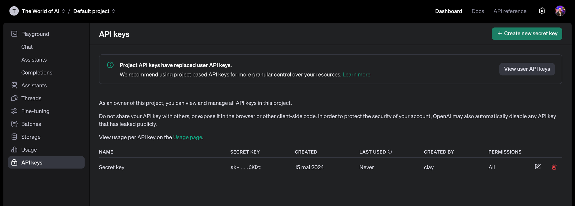 - Sur cette page, cliquez sur "Create new secret key" pour créer votre clé API. Attention cette clé est personnelle, vous ne devez jamais la communiquer à une personne tierce. Copiez la clé pour l'utiliser dans Make