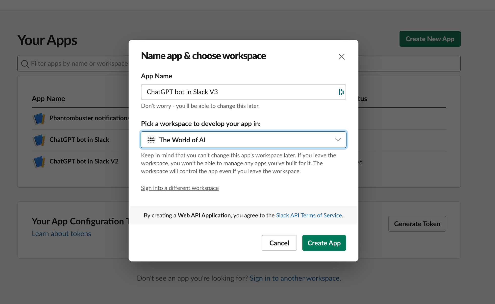- Cliquez sur "Create New App", "From Scratch" et donner un nom à votre app et sélectionner le bon Slack où déployer l'automatisation