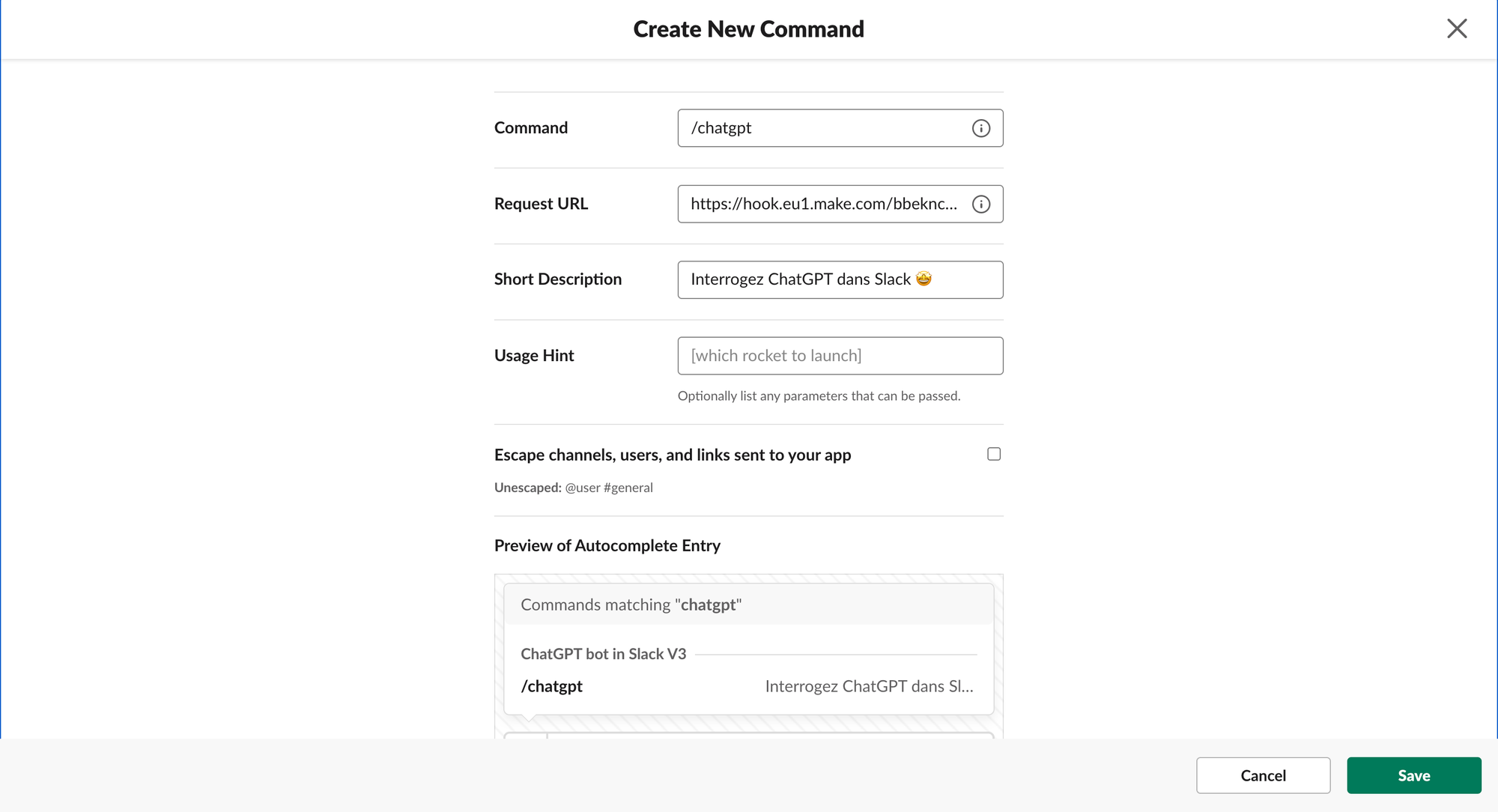- Dans "Command", mettez la commande que vous souhaitez pour activer le bot ChatGPT dans Slack. Exemple : /chatgpt