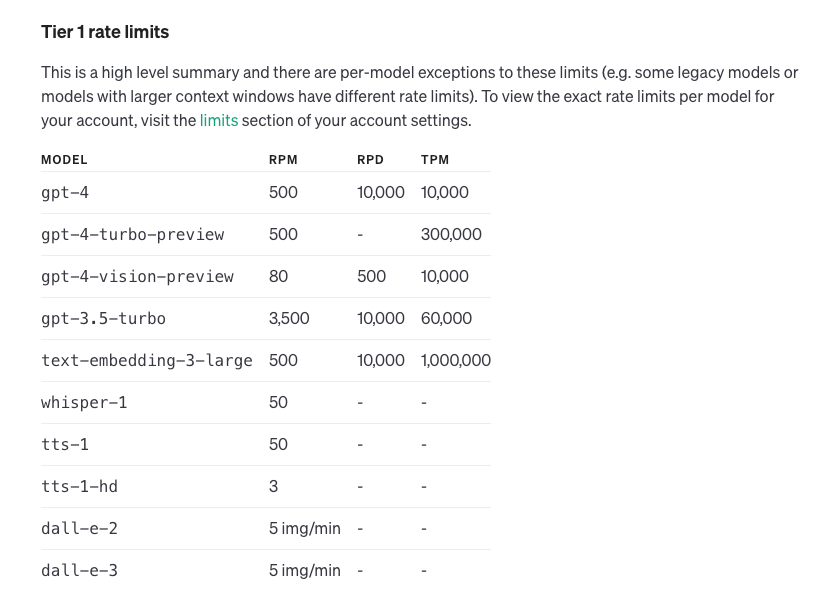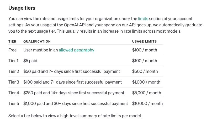 - Vous devez également recharger en crédit votre compte OpenAI avec un minimum de $5, ce qui vous permettra d'accéder au "Tier 1" et de débloquer l'accès à l'API (plus d'infos sur cet article)