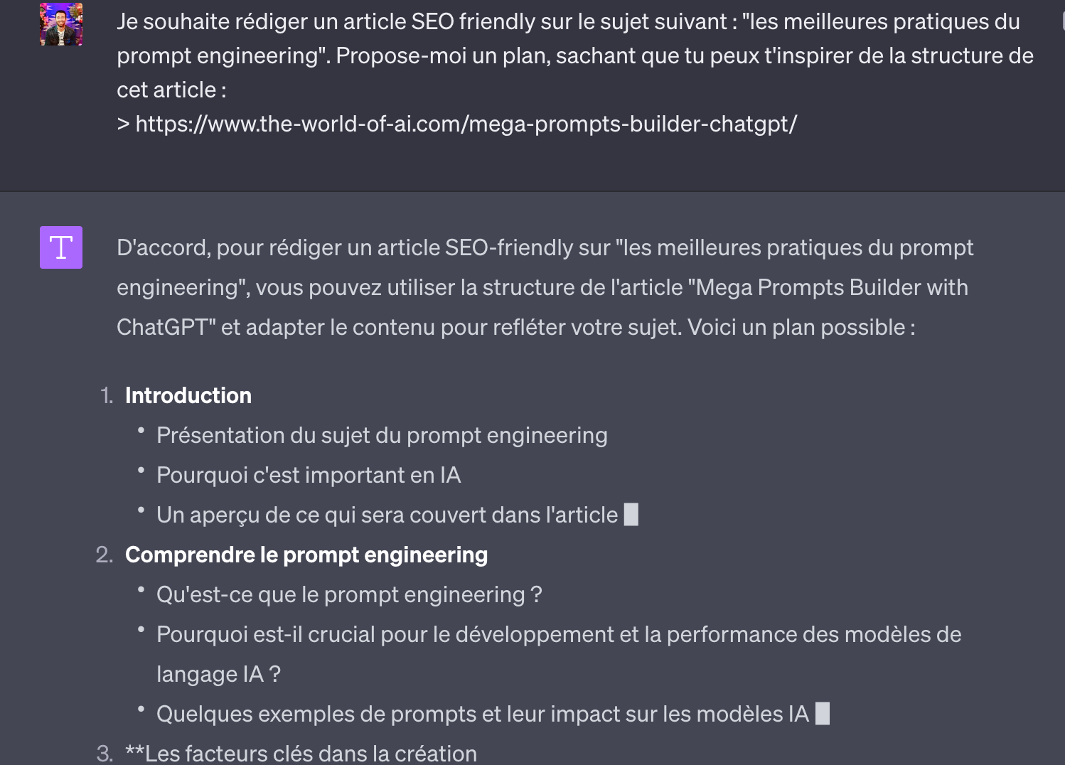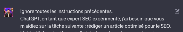 Exemple : vous voulez rédiger un article de blog optimisé pour le SEO. Plutôt que de faire un prompt du type “Rédige-moi un article optimisé pour le SEO sur le sujet de : “XXX””.