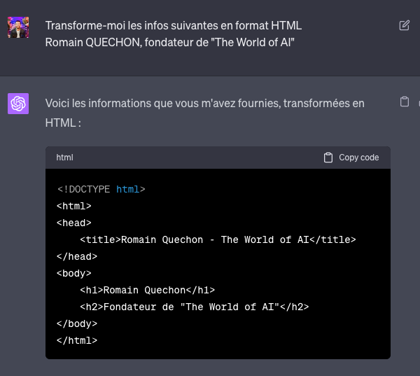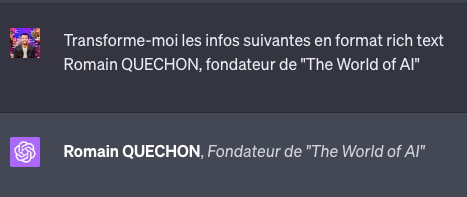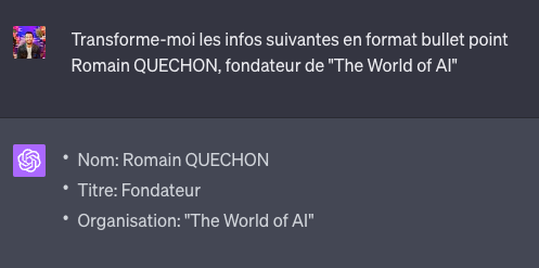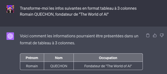 Vous pouvez demander aux IA génératives, comme ChatGPT, de vous fournir un format de données spécifiques en sortie. Voici quelques formats de données que j’utilise personnellement sur ChatGPT :