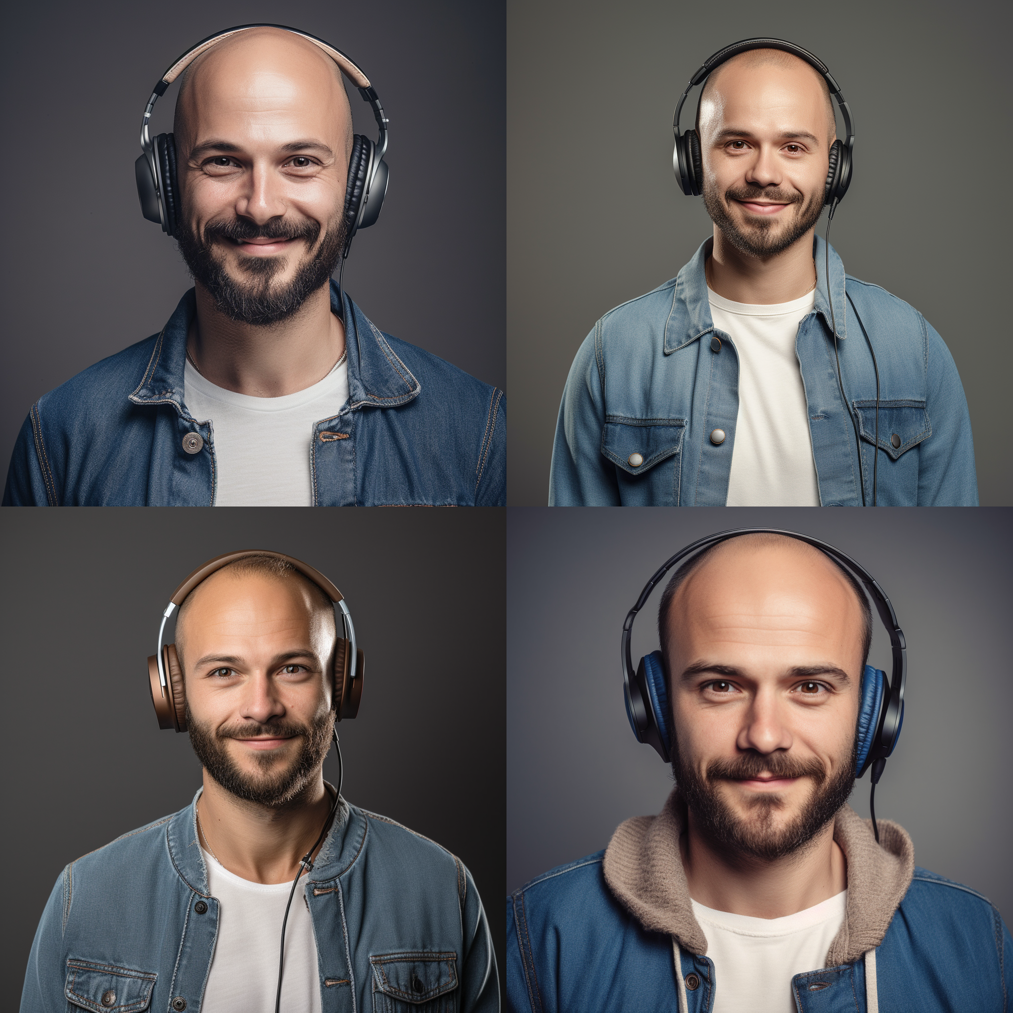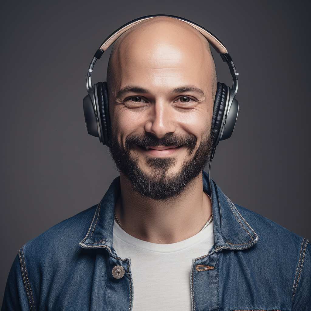 Exemple : un beau jeune homme français de 32 ans, qui s'appelle Romain, brun, cheveux courts bruns, yeux bruns, légère barbe de 3 jours, légèrement dégarni sur le front qui porte un T-shirt blanc et une veste en jeans blue, face caméra et fait la pose pour une photo. Il a également un casque audio sur les oreilles. Il est souriant, inspirant, regarde vers l'avenir, donne confiance et flirty, fond flou de couleur foncé, avec éclairage qui met en valeur le personnage