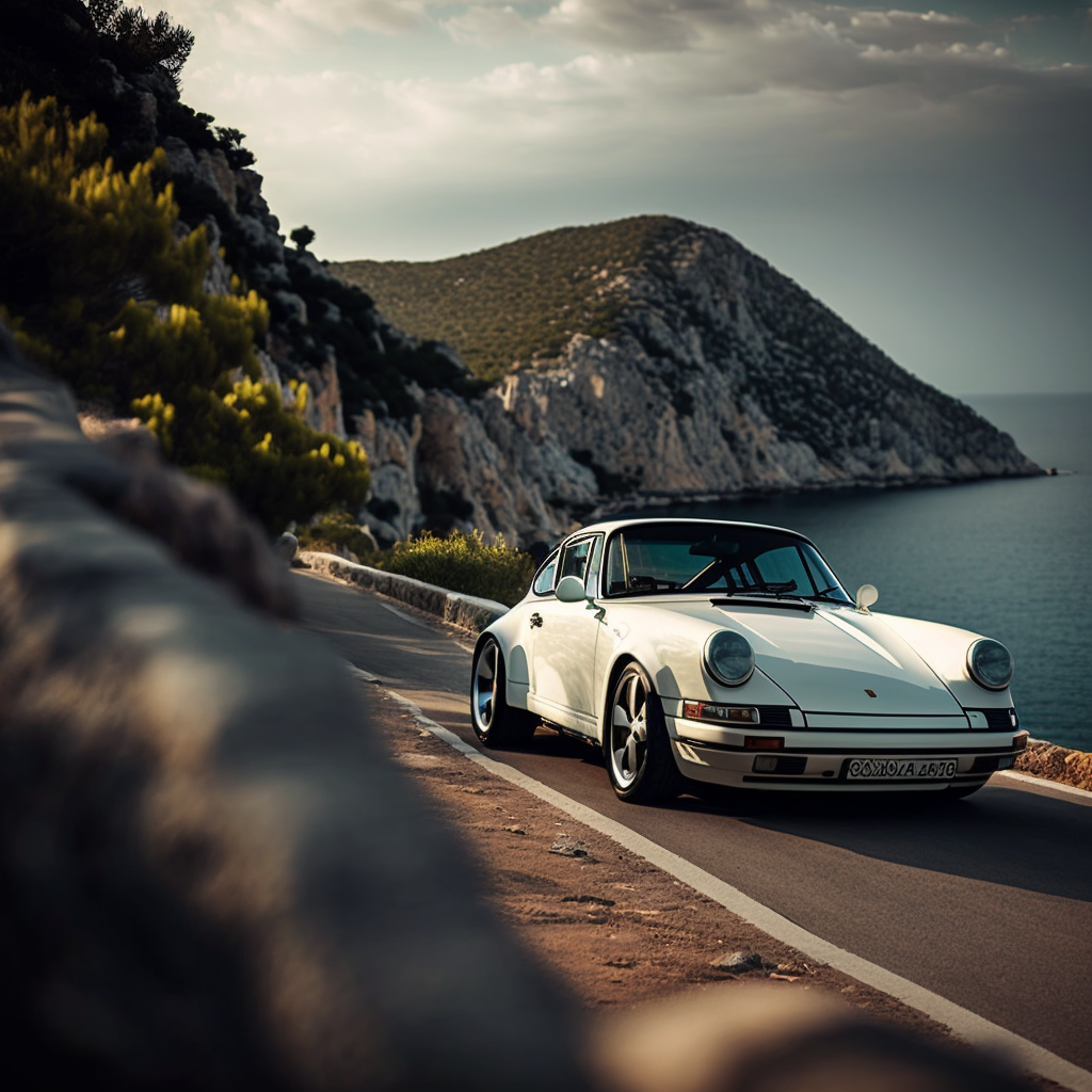 a white car driving down a road next to the ocean, an ultrafine detailed painting by Bernd Fasching, featured on unsplash, renaissance, ultrafine detail, 1970s, anamorphic lens flare