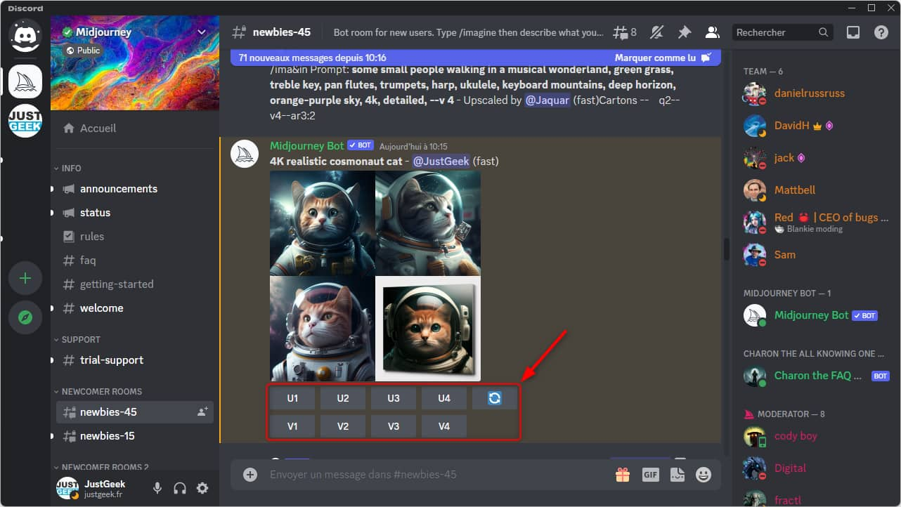 - Si une image vous satisfait, vous pouvez cliquer sur le bouton « U » (pour « Upscale ») pour obtenir une version de meilleure qualité.